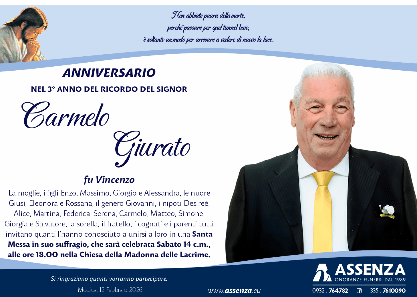 che sarà celebrata Sabato 14 c.m., alle ore 18.00 nella Chiesa della Madonna delle Lacrime.
