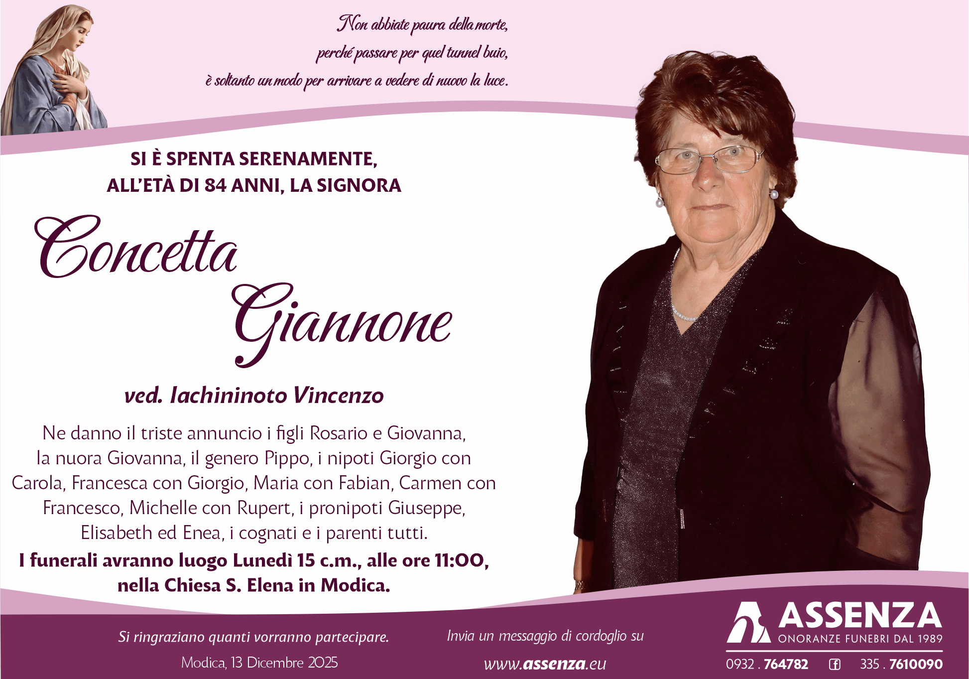 I funerali avranno luogo Lunedì 15 c.m., alle ore 11:00, nella Chiesa S. Elena in Modica.