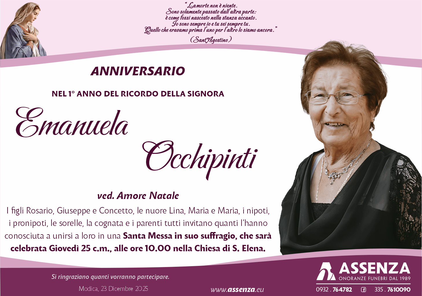 Santa Messa in suo suffragio, che sarà celebrata Giovedì 25 c.m.,
