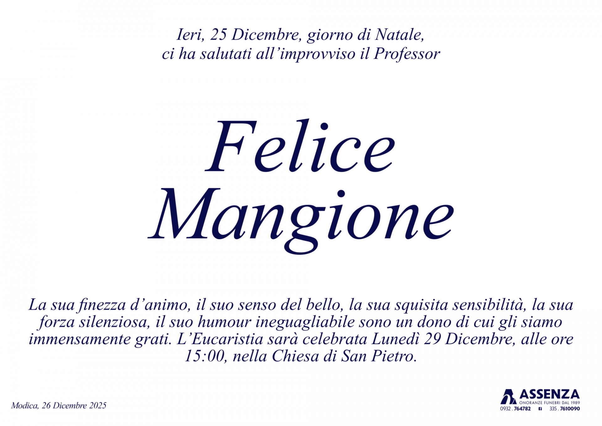 L’Eucaristia sarà celebrata Lunedì 29 Dicembre, alle ore 15:00, nella Chiesa di San Pietro.