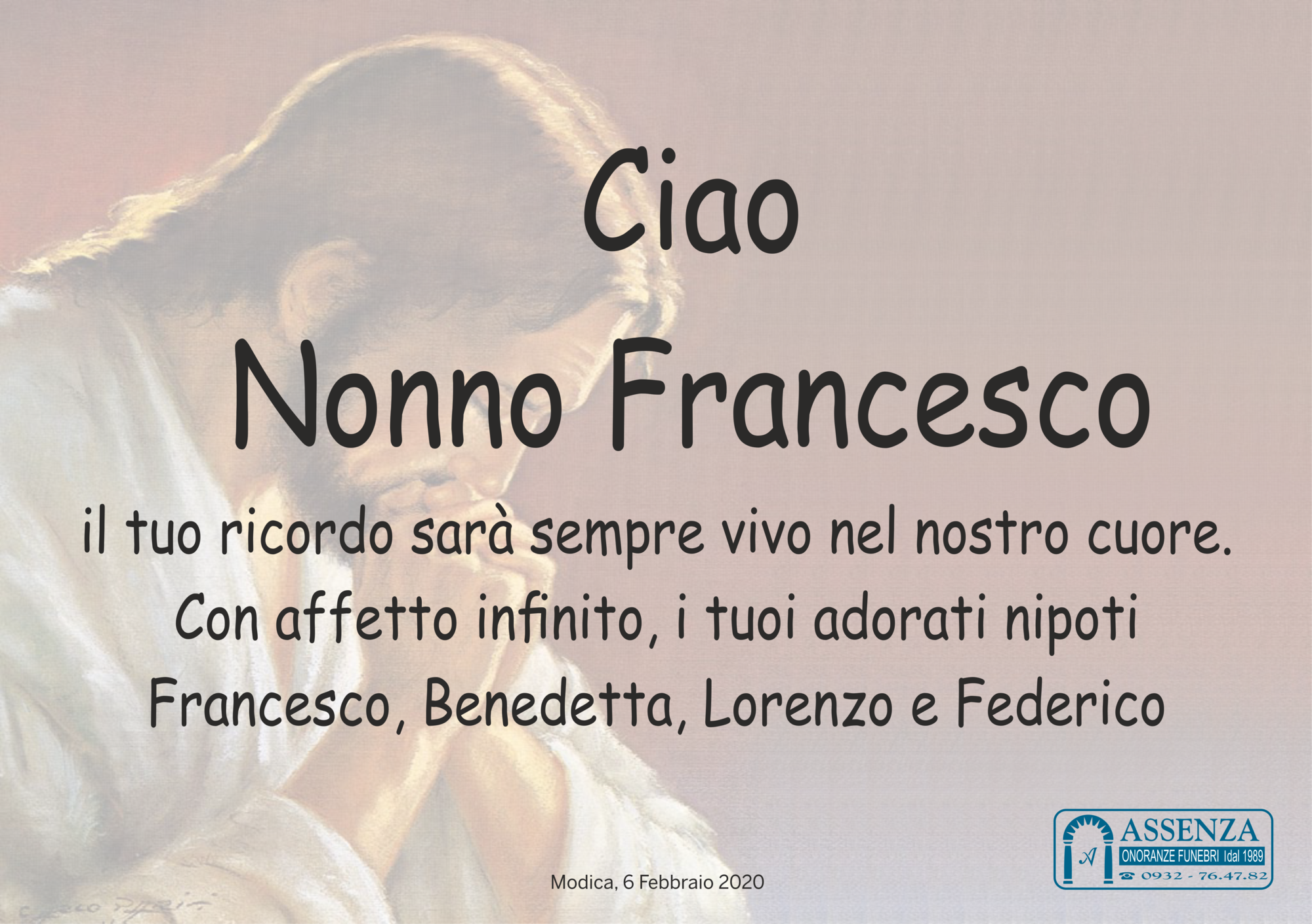 I funerali avranno luogo Sabato 8 c.m., alle ore 10:00, nella Chiesa di Sant’Elena in Modica.
