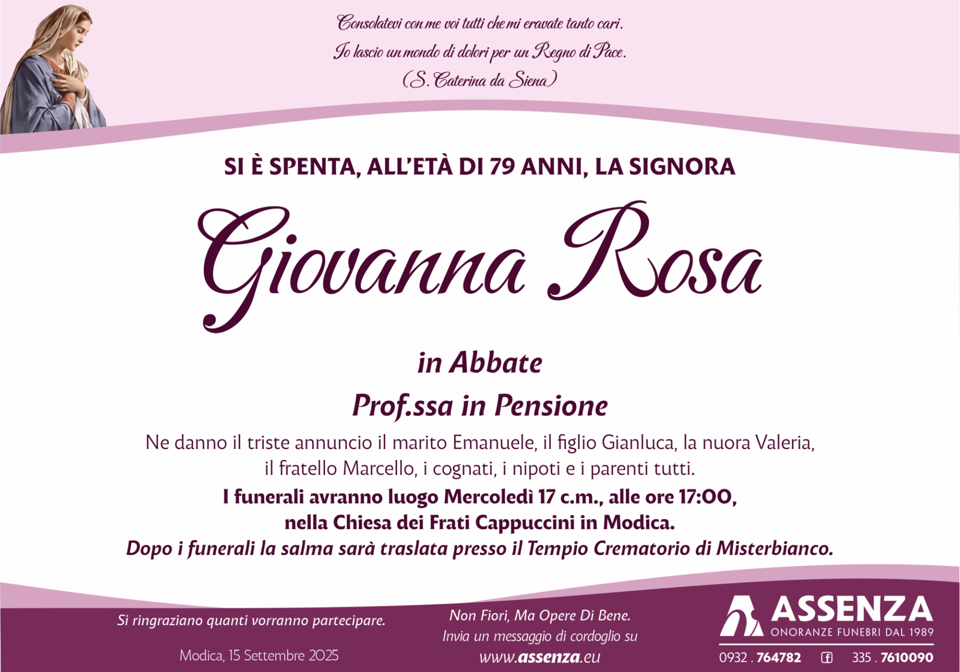 Dopo i funerali la salma sarà traslata presso il Tempio Crematorio di Misterbianco.
