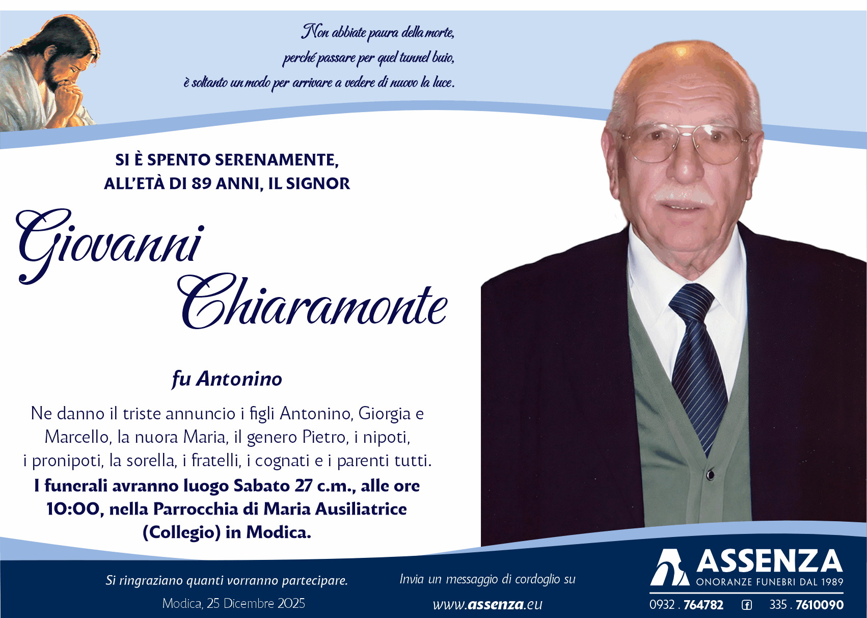 I funerali avranno luogo Sabato 27 c.m., alle ore 10:00,