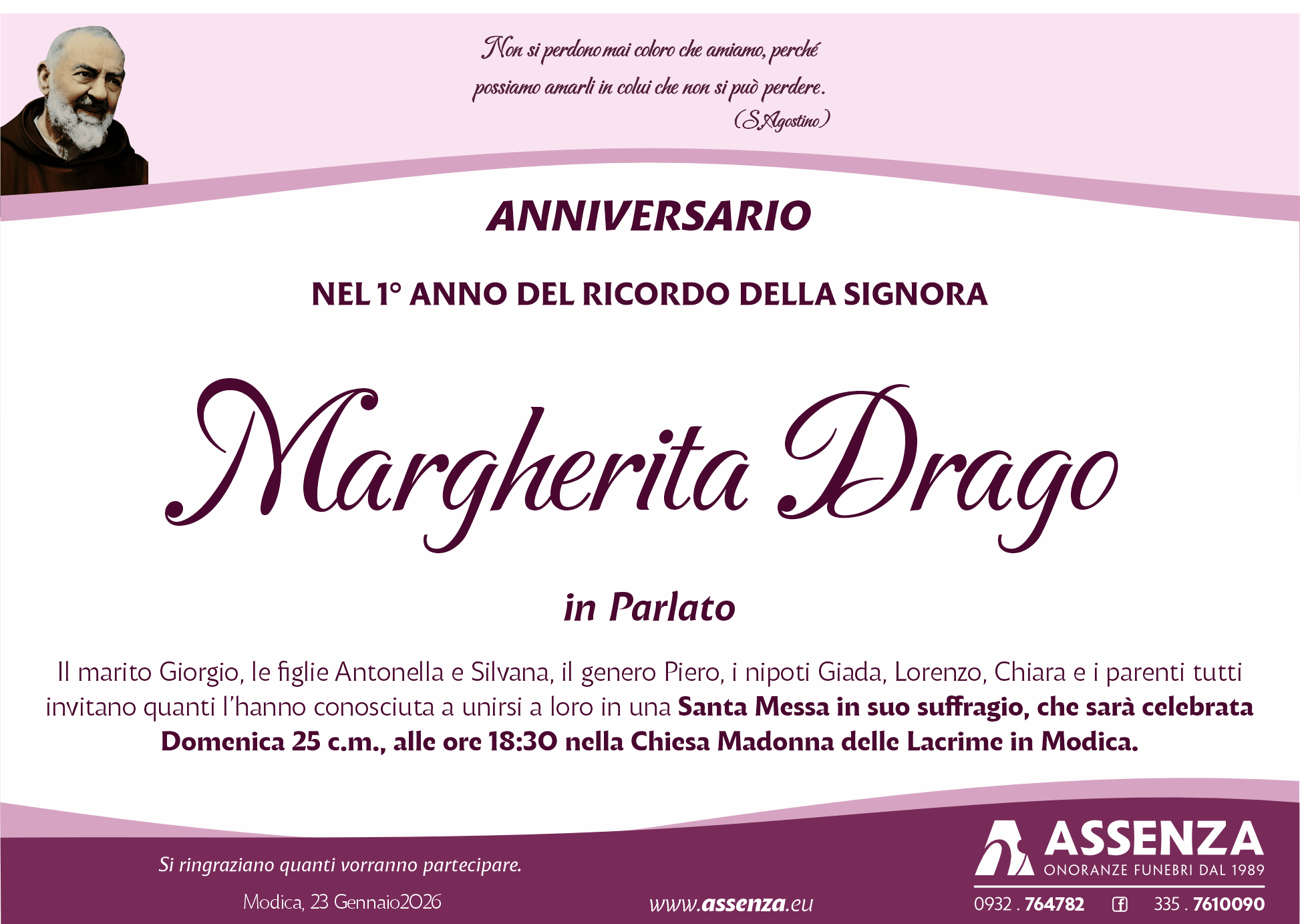 in una Santa Messa in suo suffragio, che sarà celebrata Domenica 25 c.m.,