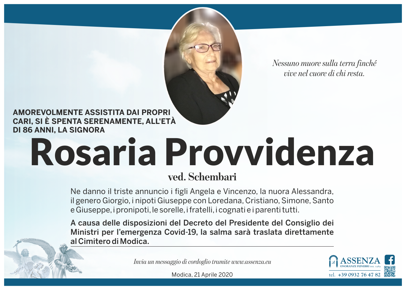 A causa delle disposizioni del Decreto del Presidente del Consiglio dei Ministri per l’emergenza Covid-19, la salma sarà traslata direttamente al Cimitero di Modica.